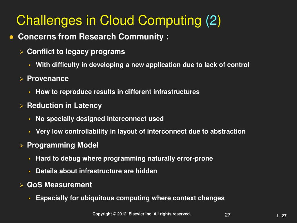 Challenges in Cloud Computing (2) Concerns from Research Community : Conflict to legacy programs With difficulty in developing a new application due to lack of control Provenance How to reproduce results in different infrastructures Reduction in Latency No specially designed interconnect used Very low controllability in layout of interconnect due to abstraction Programming Model Hard to debug where programming naturally error-prone Details about infrastructure are hidden QoS Measurement Especially for ubiquitous computing where context changes
