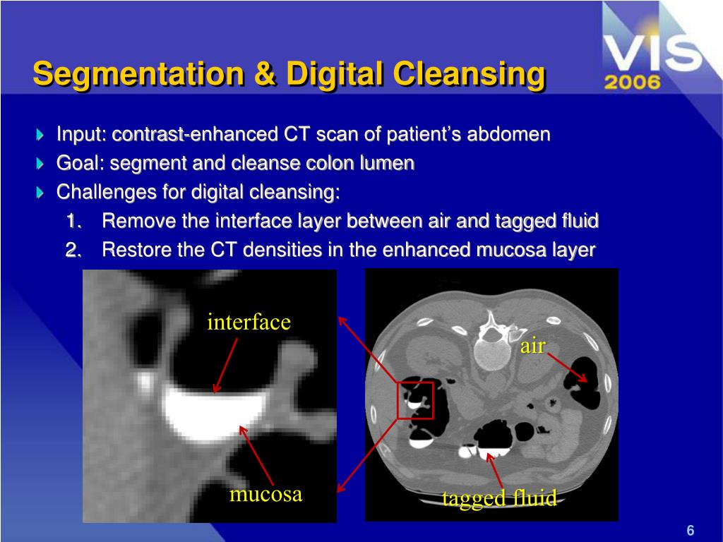 Segmentation & Digital Cleansing • Input: contrast-enhanced CT scan of patient’s abdomen • Goal: segment and cleanse colon lumen • Challenges for digital cleansing: • Remove the interface layer between air and tagged fluid • Restore the CT densities in the enhanced mucosa layer interface air mucosa tagged fluid