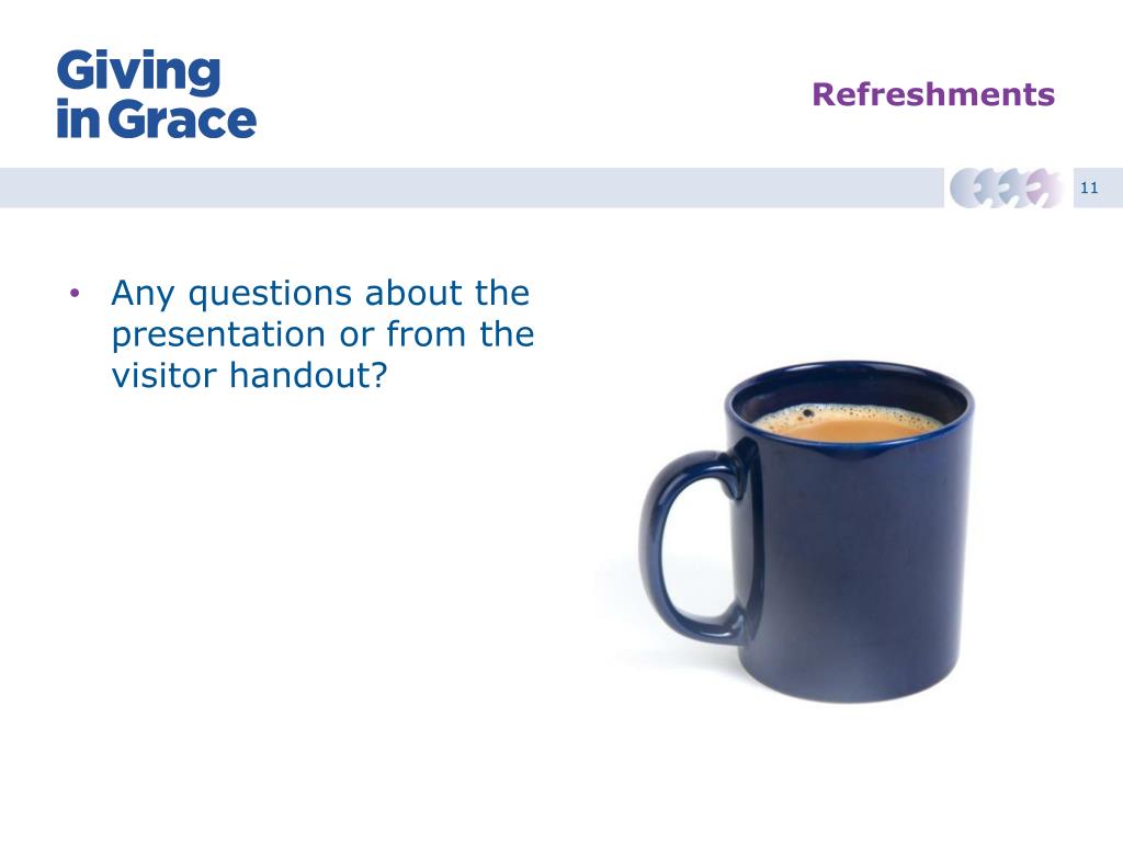 Refreshments • Any questions about the presentation or from the visitor handout?