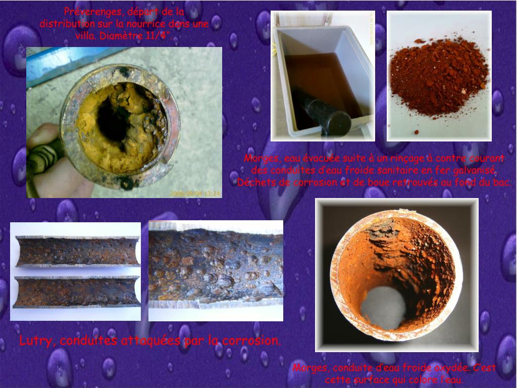Préverenges, départ de ladistribution sur la nourrice dans unevilla. Diamètre 11/4“. Morges, eau évacuée suite à un rinçage à contre courantdes conduites d’eau froide sanitaire en fer galvanisé. Déchets de corrosion et de boue retrouvés au fond du bac. Lutry, conduites attaquées par la corrosion. Morges, conduite d’eau froide oxydée. C’estcette surface qui colore l’eau.