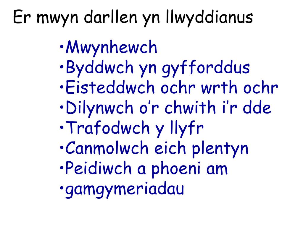 Er mwyn darllen yn llwyddianus • Mwynhewch • Byddwch yn gyfforddus • Eisteddwch ochr wrth ochr • Dilynwch o’r chwith i’r dde • Trafodwch y llyfr • Canmolwch eich plentyn • Peidiwch a phoeni am • gamgymeriadau