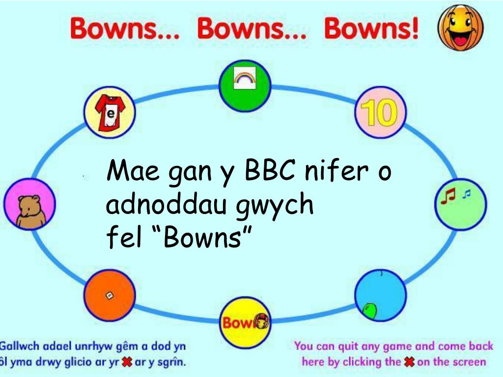 Mae gan y BBC nifer o adnoddau gwych fel “Bowns”