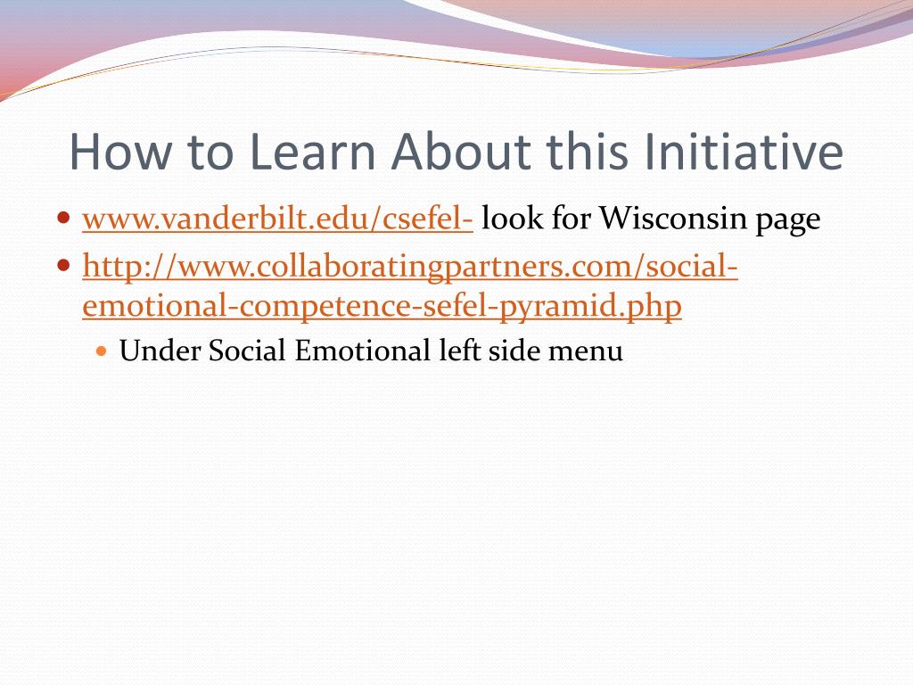 How to Learn About this Initiative • www.vanderbilt.edu/csefel- look for Wisconsin page • http://www.collaboratingpartners.com/social-emotional-competence-sefel-pyramid.php • Under Social Emotional left side menu