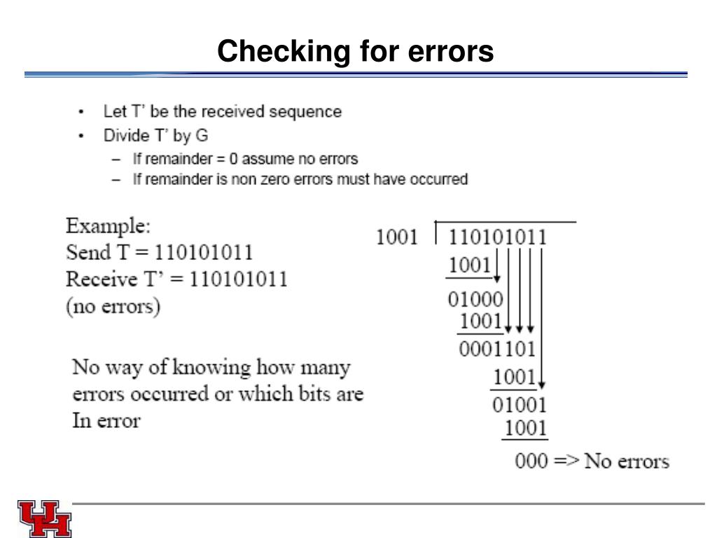 Capability of CRC • An error E(X) is undetectable if it is divisible by G(x). The following can be detected. • All single-bit errors if G(x) has more than one nonzero term • All double-bit errors if G(x) has a factor with three terms • Any odd number of errors, if P(x) contain a factor x+1 • Any burst with length less or equal to n-k • A fraction of error burst of length n-k+1; the fraction is 1-2^(-(-n-k-1)). • A fraction of error burst of length greater than n-k+1; the fraction is 1-2^(-(n-k)). • Powerful error detection; more computation complexity compared to Internet checksum