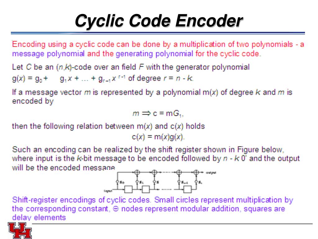 BCH Code • Bose, Ray-Chaudhuri, Hocquenghem • Multiple error correcting ability • Ease of encoding and decoding • Most powerful cyclic code • For any positive integer m and t<2^(m-1), there exists a t-error correcting (n,k) code with n=2^m-1 and n-k<=mt. • Industry standards • (511, 493) BCH code in ITU-T. Rec. H.261 “video codec for audiovisual service at kbit/s” a video coding a standard used for video conferencing and video phone. • (40, 32) BCH code in ATM (Asynchronous Transfer Mode)