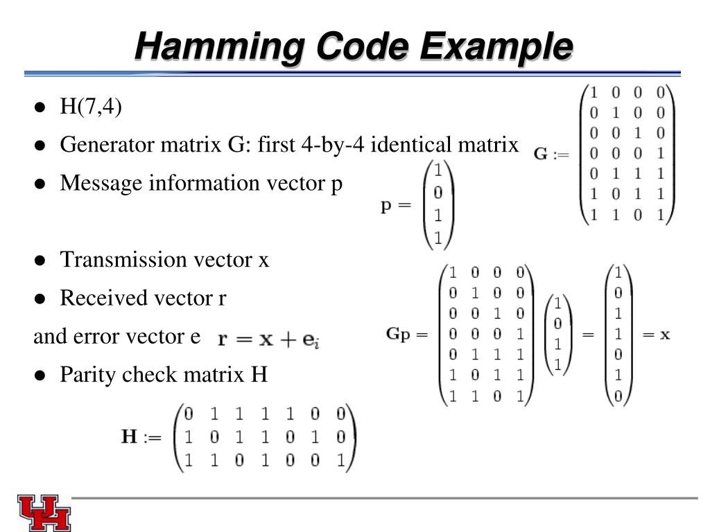 Hamming Code Example • H(7,4) • Generator matrix G: first 4-by-4 identical matrix • Message information vector p • Transmission vector x • Received vector r and error vector e • Parity check matrix H