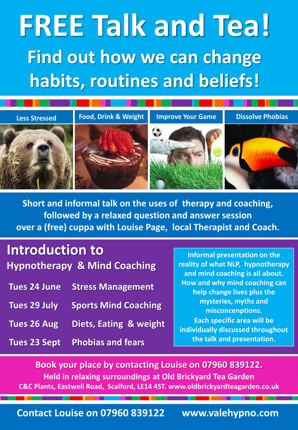 FREE Talk and Tea! Find out how we can change habits, routines and beliefs! Short and informal talk on the uses of therapy and coaching, followed by a relaxed question and answer session over a (free) cuppa with Louise Page, local Therapist and Coach. Introduction to Hypnotherapy & Mind Coaching Tues 24 June Stress Management Tues 29 July Sports Mind Coaching Tues 26 Aug Diets, Eating & weight Tues 23 Sept Phobias and fears Informal presentation on the reality of what NLP, hypnotherapy and mind coaching is all about. How and why mind coaching can help change lives plus the mysteries, myths and misconcenptions. Each specific area will be individually discussed throughout the talk and presentation. Book your place by contacting Louise on 07960 839122. Held in relaxing surroundings at Old Brickyard Tea Garden C&C Plants, Eastwell Road, Scalford, LE14 4ST. www.oldbrickyardteagarden.co.uk Contact Louise on 07960 839122 www.valehypno.com