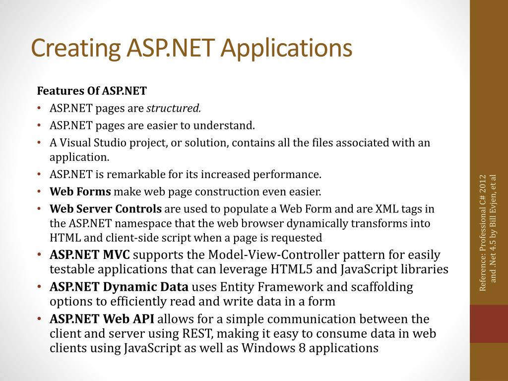 Creating ASP.NET Applications Features Of ASP.NET • ASP.NET pages are structured. • ASP.NET pages are easier to understand. • A Visual Studio project, or solution, contains all the files associated with an application. • ASP.NET is remarkable for its increased performance. • Web Forms make web page construction even easier. • Web Server Controls areused to populate a Web Form and are XML tags in the ASP.NET namespace that the web browser dynamically transforms into HTML and client-side script when a page is requested • ASP.NET MVC supports the Model-View-Controller pattern for easily testable applications that can leverage HTML5 and JavaScript libraries • ASP.NET Dynamic Data uses Entity Framework and scaffolding options to efficiently read and write data in a form • ASP.NET Web API allows for a simple communication between the client and server using REST, making it easy to consume data in web clients using JavaScript as well as Windows 8 applications Reference: Professional C# 2012 and .Net 4.5 by Bill Evjen, et al