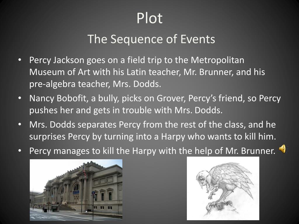 PlotThe Sequence of Events • Percy Jackson goes on a field trip to the Metropolitan Museum of Art with his Latin teacher, Mr. Brunner, and his pre-algebra teacher, Mrs. Dodds. • Nancy Bobofit, a bully, picks on Grover, Percy’s friend, so Percy pushes her and gets in trouble with Mrs. Dodds. • Mrs. Dodds separates Percy from the rest of the class, and he surprises Percy by turning into a Harpy who wants to kill him. • Percy manages to kill the Harpy with the help of Mr. Brunner.