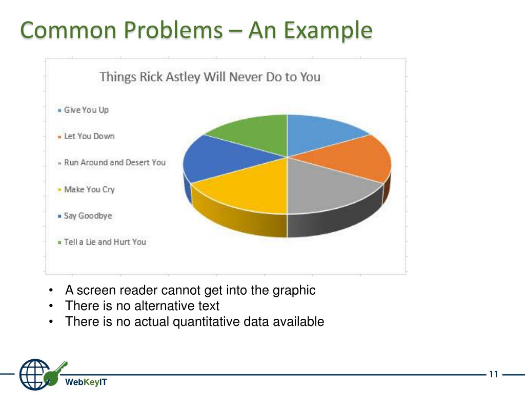 Common Problems – An Example • A screen reader cannot get into the graphic • There is no alternative text • There is no actual quantitative data available
