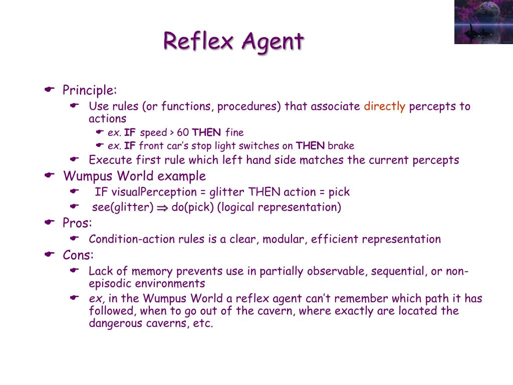 Reflex Agent • Principle: • Use rules (or functions, procedures) that associate directly percepts to actions • ex.IF speed > 60 THEN fine • ex.IF front car’s stop light switches on THEN brake • Execute first rule which left hand side matches the current percepts • Wumpus World example • IF visualPerception = glitter THEN action = pick • see(glitter) do(pick) (logical representation) • Pros: • Condition-action rules is a clear, modular, efficient representation • Cons: • Lack of memory prevents use in partially observable, sequential, or non-episodic environments • ex, in the Wumpus World a reflex agent can’t remember which path it has followed, when to go out of the cavern, where exactly are located the dangerous caverns, etc.