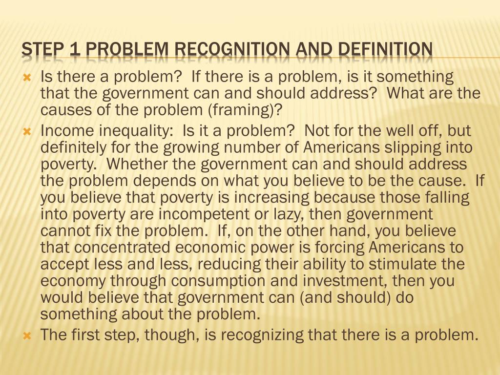 Is there a problem? If there is a problem, is it something that the government can and should address? What are the causes of the problem (framing)? Income inequality: Is it a problem? Not for the well off, but definitely for the growing number of Americans slipping into poverty. Whether the government can and should address the problem depends on what you believe to be the cause. If you believe that poverty is increasing because those falling into poverty are incompetent or lazy, then government cannot fix the problem. If, on the other hand, you believe that concentrated economic power is forcing Americans to accept less and less, reducing their ability to stimulate the economy through consumption and investment, then you would believe that government can (and should) do something about the problem. The first step, though, is recognizing that there is a problem. Step 1 problem recognition and definition