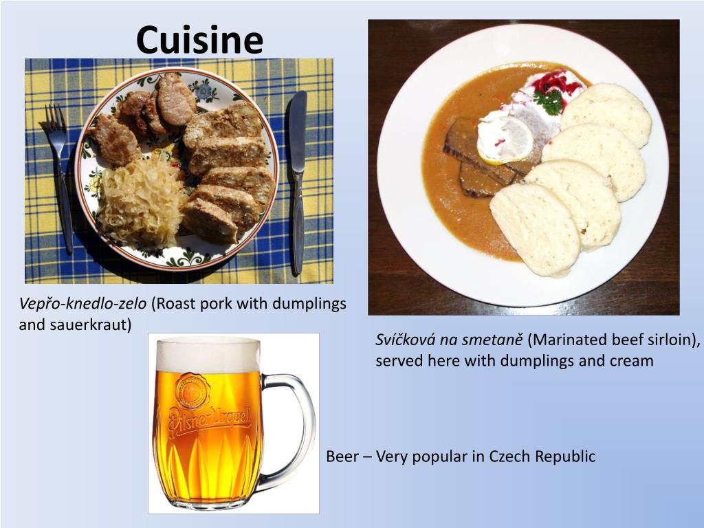 Cuisine Vepřo-knedlo-zelo (Roastporkwithdumplings and sauerkraut) Svíčková na smetaně (Marinatedbeefsirloin), servedherewithdumplings and cream Beer – Very popular in Czech Republic