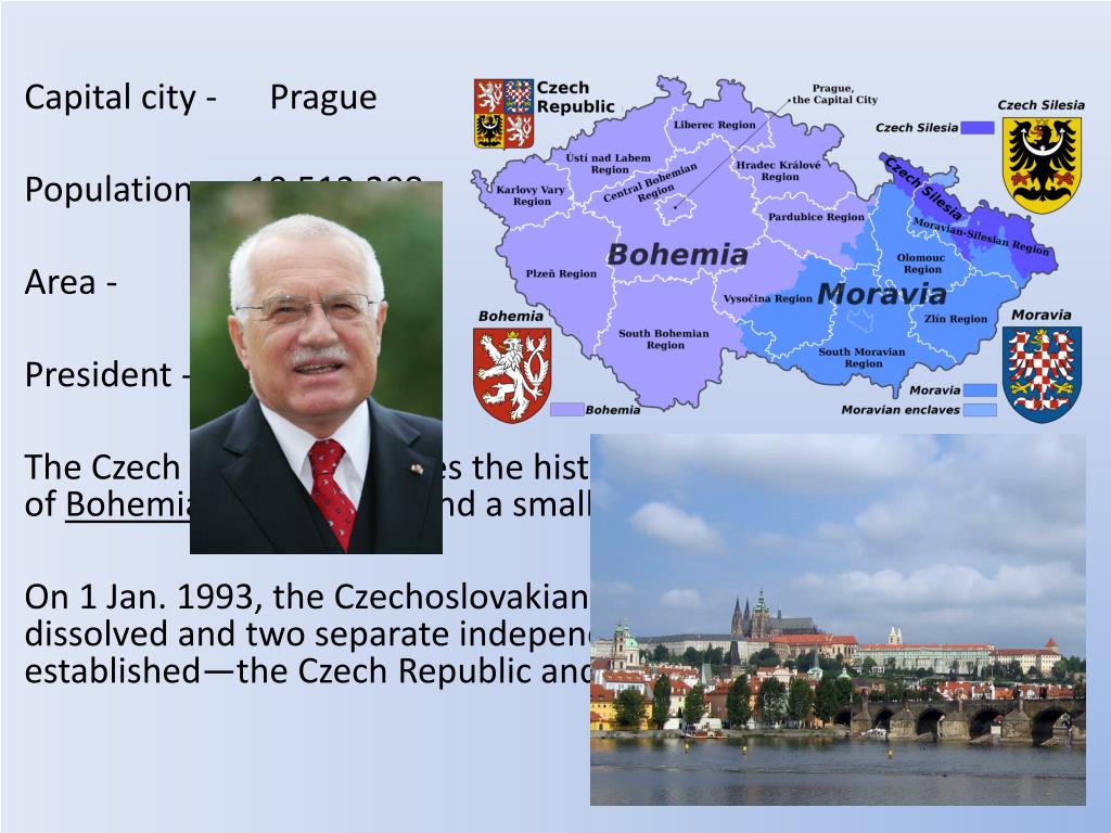 Capital city - Prague Population - 10,512,208 Area - 78,866 km2 President - Václav Klaus The Czech Republic includes the historical territories of Bohemia and Moravia and a small part of Silesia. On 1 Jan.1993, the Czechoslovakian federation was dissolved and two separate independent countries were established—the Czech Republic and Slovakia.