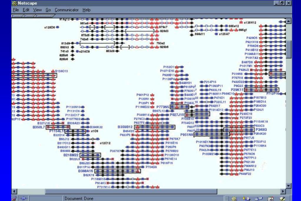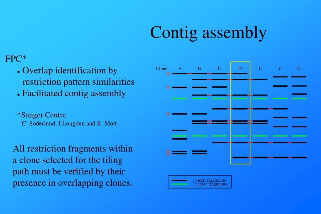 A B C D E F G * * * * * * Contig assembly FPC* • Overlap identification by restriction pattern similarities • Facilitated contig assembly • *Sanger Centre • C. Soderlund, I Longden and R. Mott Clone All restriction fragments within a clone selected for the tiling path must be verified by their presence in overlapping clones. : insert fragments : vector fragments