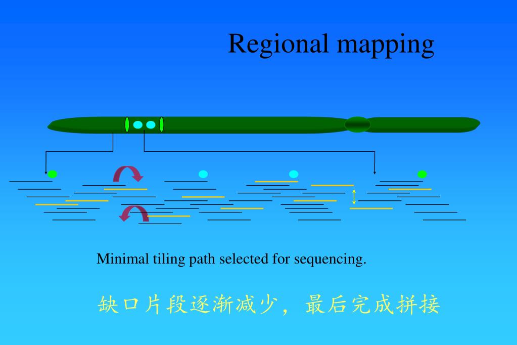 Regional mapping Minimal tiling path selected for sequencing. 缺口片段逐渐减少,最后完成拼接
