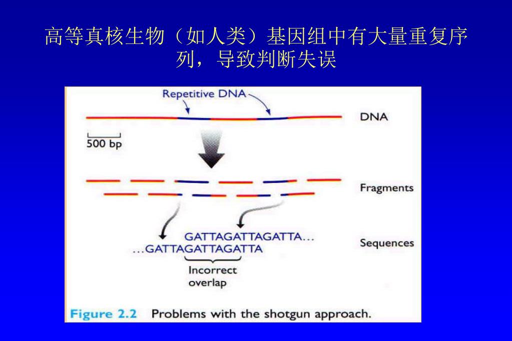 高等真核生物(如人类)基因组中有大量重复序列,导致判断失误高等真核生物(如人类)基因组中有大量重复序列,导致判断失误