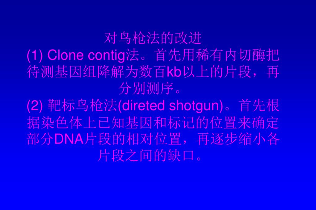 对鸟枪法的改进(1) Clone contig法。首先用稀有内切酶把待测基因组降解为数百kb以上的片段,再分别测序。(2) 靶标鸟枪法(direted shotgun)。首先根据染色体上已知基因和标记的位置来确定部分DNA片段的相对位置,再逐步缩小各片段之间的缺口。