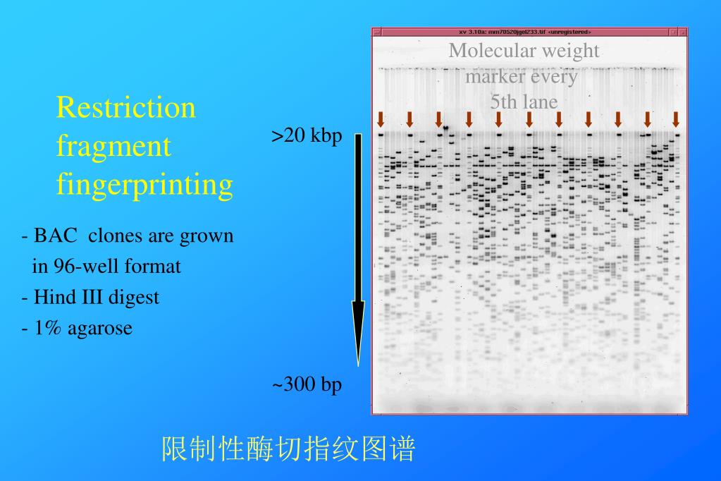 >20 kbp ~300 bp Molecular weight marker every 5th lane Restriction fragment fingerprinting - BAC clones are grown in 96-well format - Hind III digest - 1% agarose 限制性酶切指纹图谱