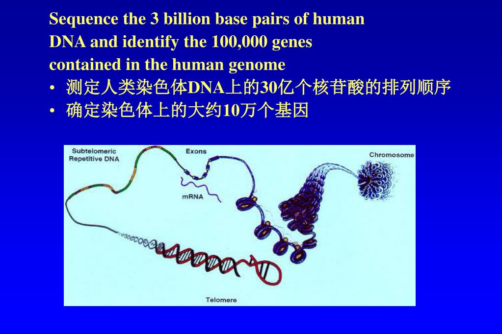 Sequence the 3 billion base pairs of human DNA and identify the 100,000 genes contained in the human genome • 测定人类染色体DNA上的30亿个核苷酸的排列顺序 • 确定染色体上的大约10万个基因