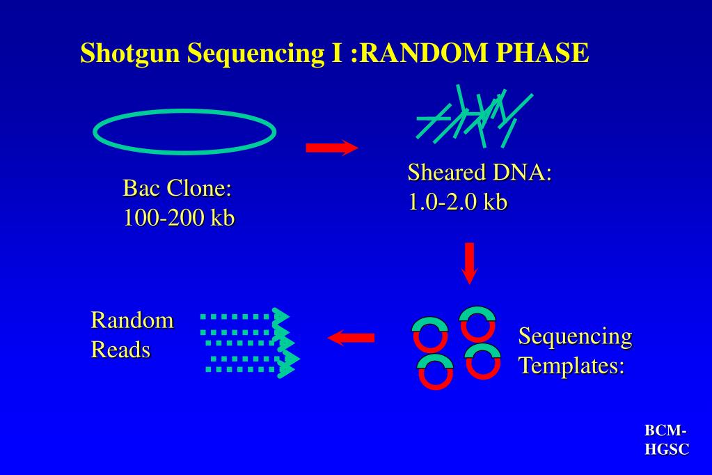 Shotgun Sequencing I :RANDOM PHASE Sheared DNA: 1.0-2.0 kb Bac Clone: 100-200 kb Random Reads Sequencing Templates: BCM- HGSC