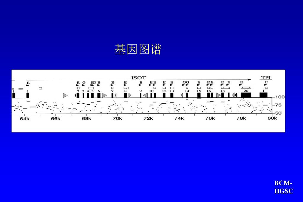 序列图谱: 30亿个核苷酸组成的人类基因组的序列图 • 基因图谱: 人类基因组中鉴别出占据2-5%长度的全部基因的位置、结构与功能