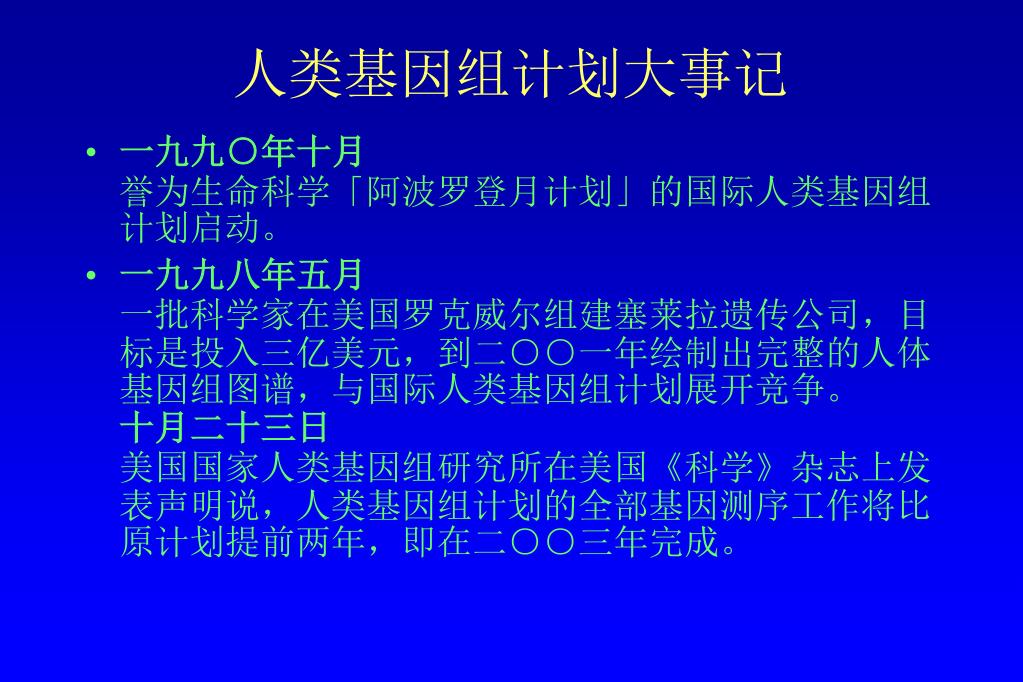 人类基因组计划大事记 • 一九九○年十月誉为生命科学「阿波罗登月计划」的国际人类基因组计划启动。 • 一九九八年五月一批科学家在美国罗克威尔组建塞莱拉遗传公司,目标是投入三亿美元,到二○○一年绘制出完整的人体基因组图谱,与国际人类基因组计划展开竞争。十月二十三日美国国家人类基因组研究所在美国《科学》杂志上发表声明说,人类基因组计划的全部基因测序工作将比原计划提前两年,即在二○○三年完成。