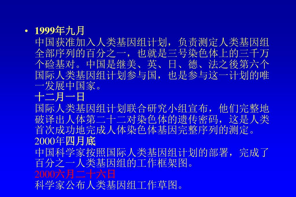1999年九月中国获准加入人类基因组计划,负责测定人类基因组全部序列的百分之一,也就是三号染色体上的三千万个硷基对。中国是继美、英、日、德、法之後第六个国际人类基因组计划参与国,也是参与这一计划的唯一发展中国家。十二月一日国际人类基因组计划联合研究小组宣布,他们完整地破译出人体第二十二对染色体的遗传密码,这是人类首次成功地完成人体染色体基因完整序列的测定。2000年四月底中国科学家按照国际人类基因组计划的部署,完成了百分之一人类基因组的工作框架图。2000六月二十六日科学家公布人类基因组工作草图。1999年九月中国获准加入人类基因组计划,负责测定人类基因组全部序列的百分之一,也就是三号染色体上的三千万个硷基对。中国是继美、英、日、德、法之後第六个国际人类基因组计划参与国,也是参与这一计划的唯一发展中国家。十二月一日国际人类基因组计划联合研究小组宣布,他们完整地破译出人体第二十二对染色体的遗传密码,这是人类首次成功地完成人体染色体基因完整序列的测定。2000年四月底中国科学家按照国际人类基因组计划的部署,完成了百分之一人类基因组的工作框架图。2000六月二十六日科学家公布人类基因组工作草图。