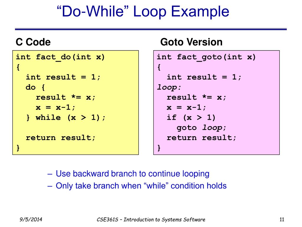 “For” “While” For Version While Version for (Init; Test; Update ) Body Init; while (Test ) { Body Update ; } Do-While Version Goto Version Init; if (!Test) goto done; do { Body Update ; } while (Test) done: Init; if (!Test) goto done; loop: Body Update ; if (Test) goto loop; done: CSE361S – Introduction to Systems Software