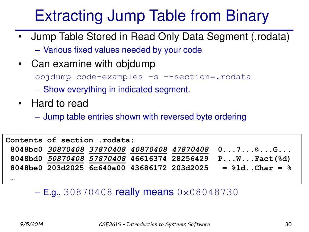 Extracting Jump Table from Binary • Jump Table Stored in Read Only Data Segment (.rodata) • Various fixed values needed by your code • Can examine with objdump objdump code-examples –s –-section=.rodata • Show everything in indicated segment. • Hard to read • Jump table entries shown with reversed byte ordering • E.g., 30870408 really means 0x08048730 Contents of section .rodata: 8048bc0 30870408378704084087040847870408 0...7...@...G... 8048bd0 5087040857870408 46616374 28256429 P...W...Fact(%d) 8048be0 203d2025 6c640a00 43686172 203d2025 = %ld..Char = % … CSE361S – Introduction to Systems Software
