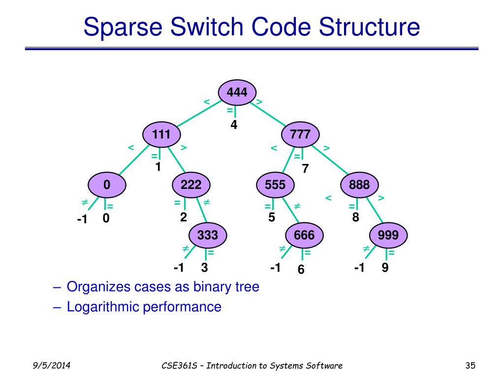 444 111 777 0 222 555 888 -1 -1 -1 -1 333 666 999 Sparse Switch Code Structure • Organizes cases as binary tree • Logarithmic performance < > = 4 < > < > = = 1 7 < > = = = = 2 5 8 0 = = = 3 9 6 CSE361S – Introduction to Systems Software