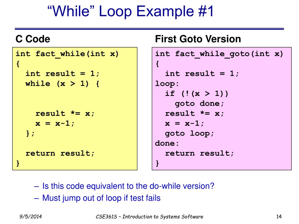 “While” Loop Example #1 C Code First Goto Version • Is this code equivalent to the do-while version? • Must jump out of loop if test fails int fact_while(int x) { int result = 1; while (x > 1) { result *= x; x = x-1; }; return result; } int fact_while_goto(int x) { int result = 1; loop: if (!(x > 1)) goto done; result *= x; x = x-1; goto loop; done: return result; } CSE361S – Introduction to Systems Software