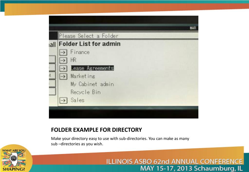 PICKING A VENDOR • Do they have the capability to download the directory software directly on my MFP or does it scan to a file folder which my staff have to access and then store. • How many users licenses do I have to purchase and are they concurrent. • Make sure that the system is not just a PDF search system whereas you place all documents into a folder and search by name.