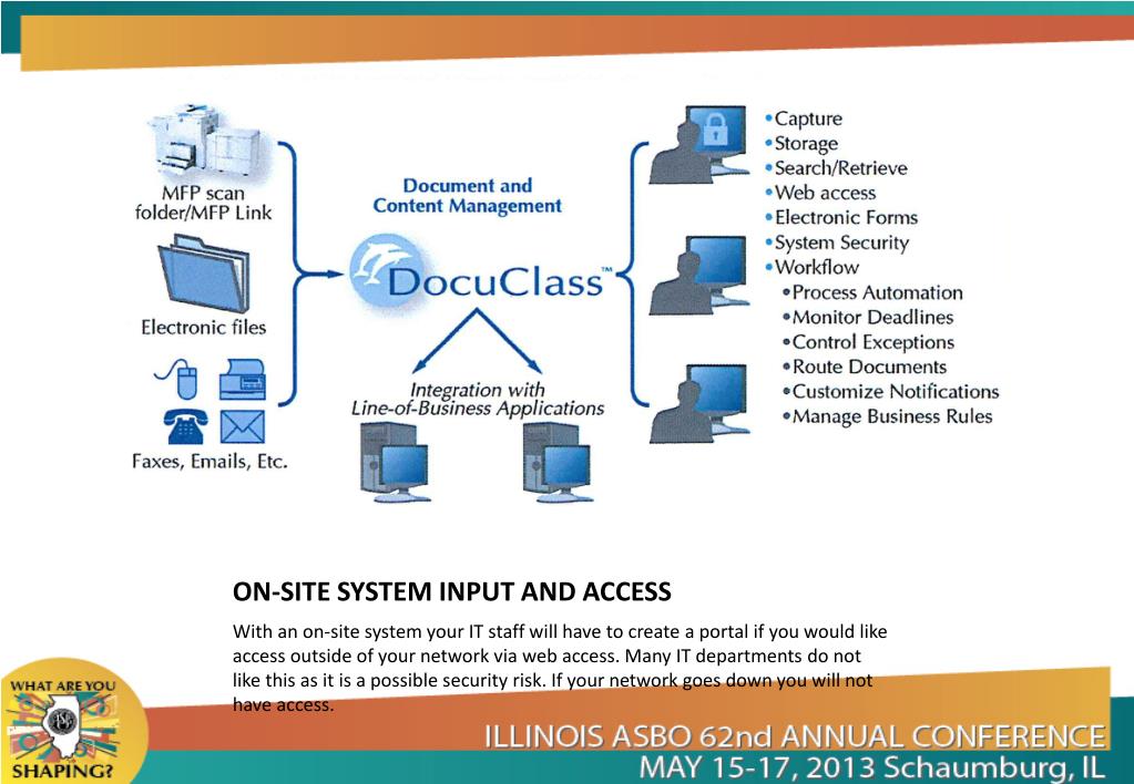 WHERE DO I START? • Choose a system that will fit your environment. • On-Site system -Will require servers, software, backup, IT maintains software and updates, access available within network. • SaaS (software as a service) – Cloud based system that requires no hardware, updates automatically, access from anywhere via web. (75% of IT Budgets are spent on maintaining software)
