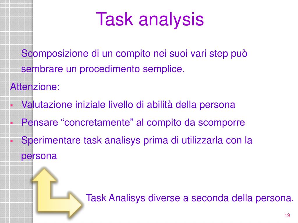 Task analysis La task analisys si riferisce alla descrizione dell’obiettivocomportamentale o meta comportamentale che ci siamo prefissati attraverso l’analisi del compito, sia nelle diverse fasi che lo compongono in sequenza sia nei prerequisiti necessari a evidenziare le diverse abilità basilari per eseguire correttamente il compito. Meazzini,1997 8