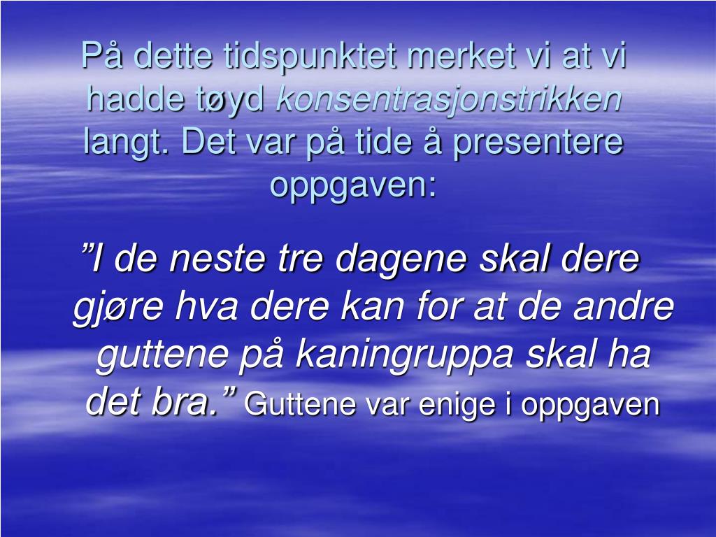 På dette tidspunktet merket vi at vi hadde tøyd konsentrasjonstrikken langt. Det var på tide å presentere oppgaven: ”I de neste tre dagene skal dere gjøre hva dere kan for at de andre guttene på kaningruppa skal ha det bra.”Guttene var enige i oppgaven