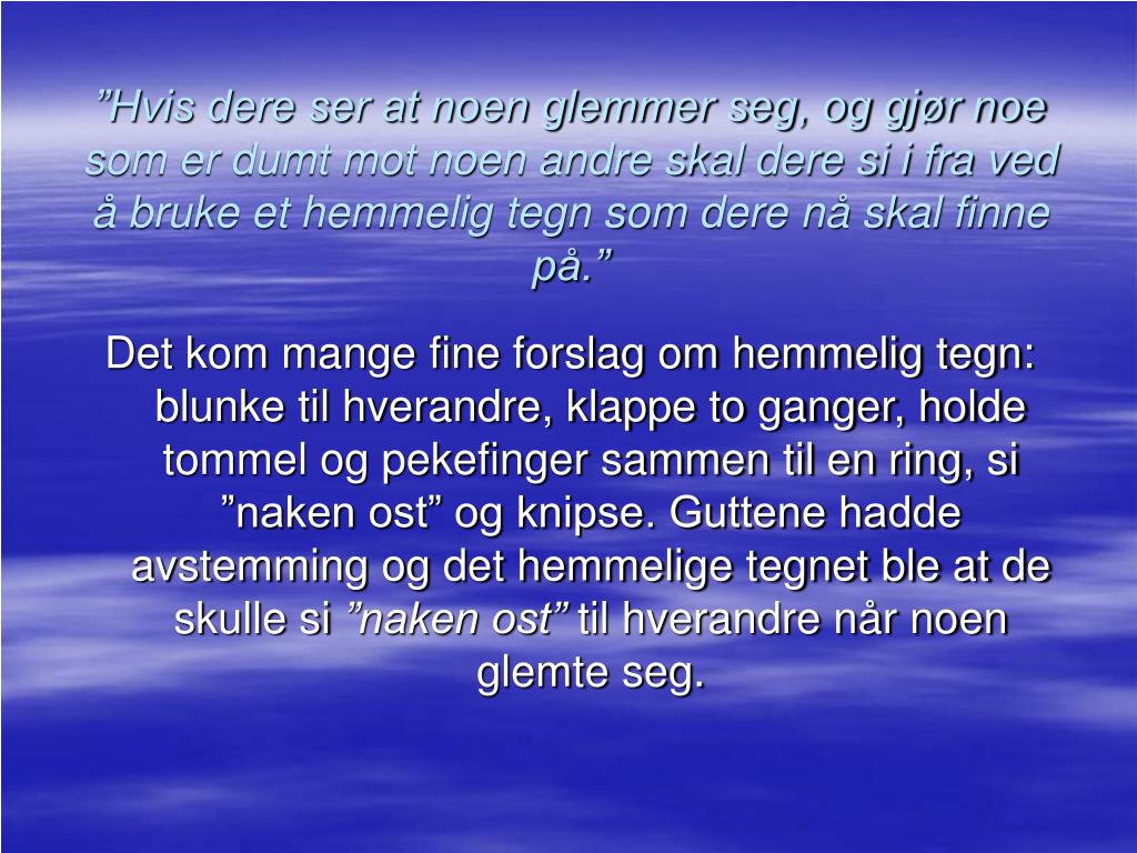”Hvis dere ser at noen glemmer seg, og gjør noe som er dumt mot noen andre skal dere si i fra ved å bruke et hemmelig tegn som dere nå skal finne på.” Det kom mange fine forslag om hemmelig tegn: blunke til hverandre, klappe to ganger, holde tommel og pekefinger sammen til en ring, si ”naken ost” og knipse. Guttene hadde avstemming og det hemmelige tegnet ble at de skulle si ”naken ost” til hverandre når noen glemte seg.