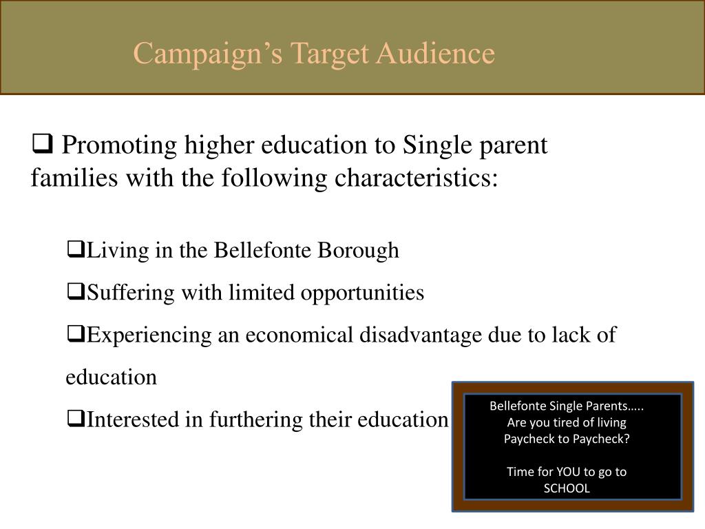 Campaign’s Target Audience • Promoting higher education to Single parent families with the following characteristics: • Living in the Bellefonte Borough • Suffering with limited opportunities • Experiencing an economical disadvantage due to lack of education • Interested in furthering their education Bellefonte Single Parents….. Are you tired of living Paycheck to Paycheck? Time for YOU to go to SCHOOL