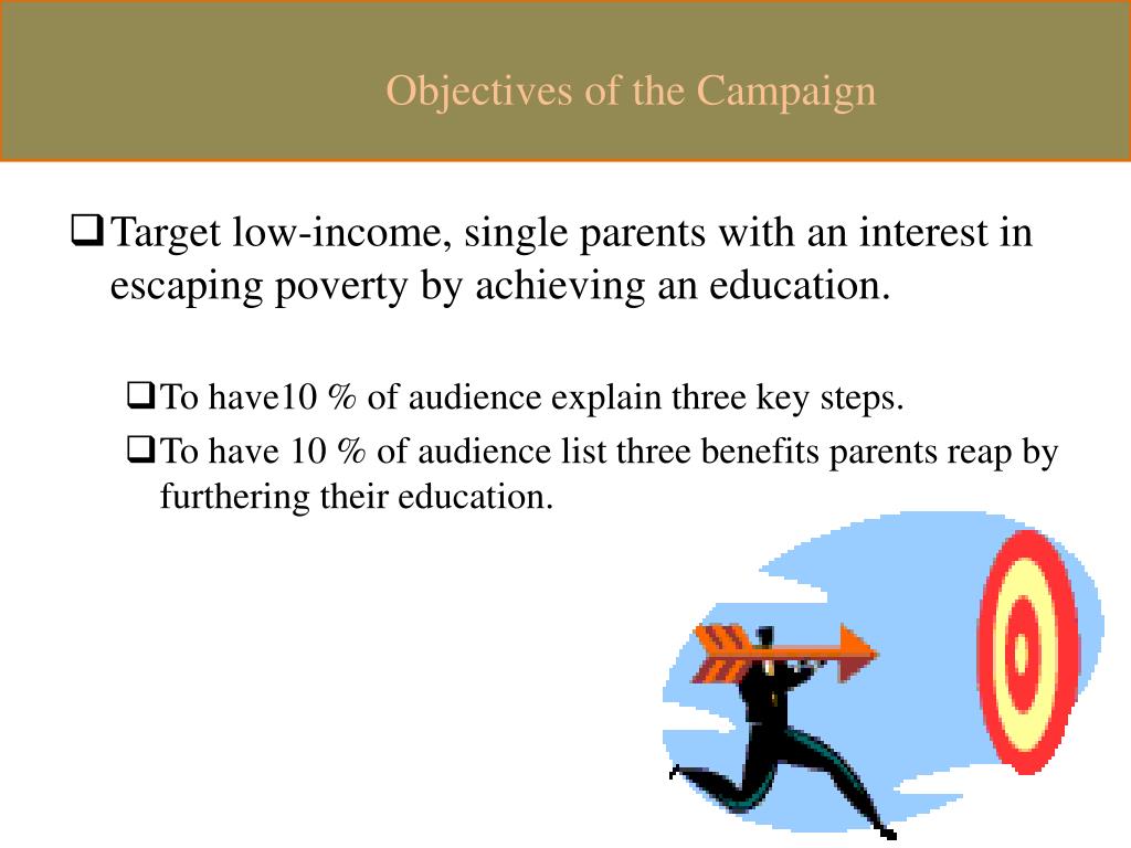 Objectives of the Campaign • Target low-income, single parents with an interest in escaping poverty by achieving an education. • To have10 % of audience explain three key steps. • To have 10 % of audience list three benefits parents reap by furthering their education.