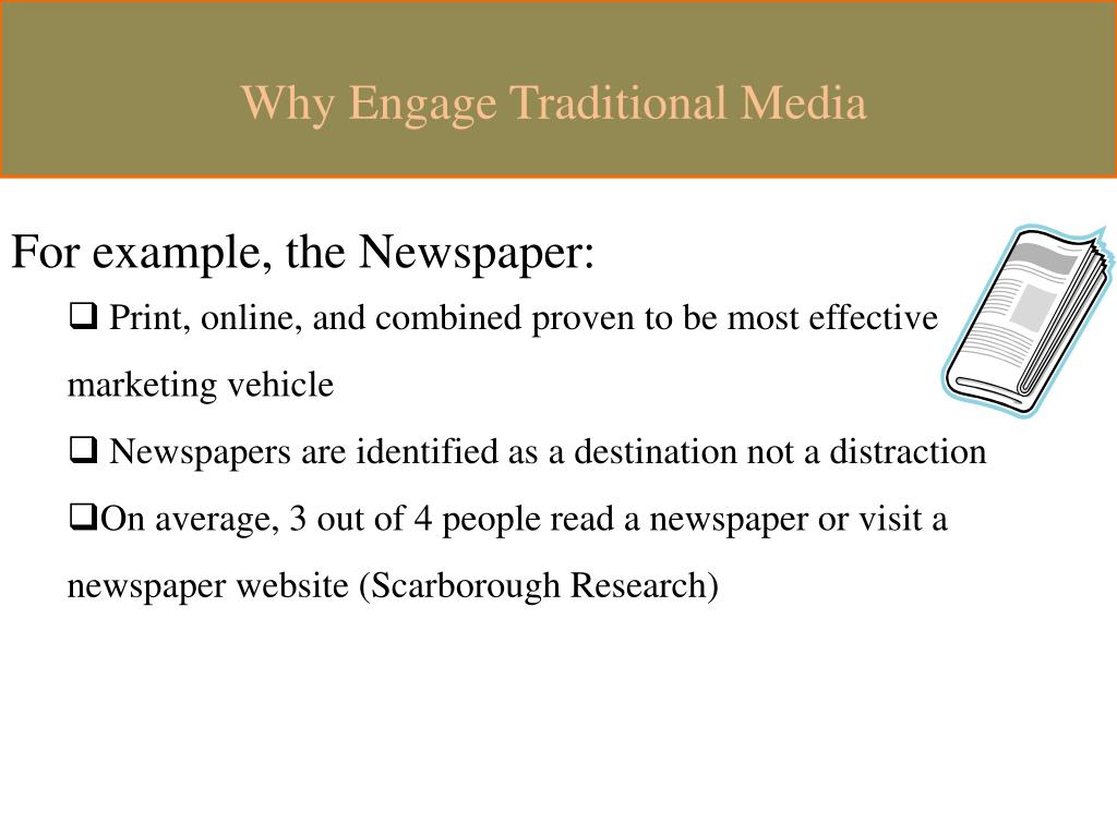 Why Engage Traditional Media • For example, the Newspaper: • Print, online, and combined proven to be most effective marketing vehicle • Newspapers are identified as a destination not a distraction • On average, 3 out of 4 people read a newspaper or visit a newspaper website (Scarborough Research)