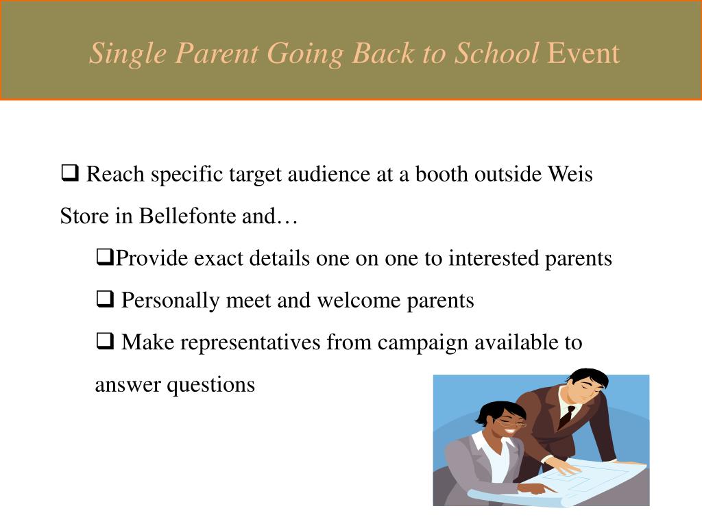 Single Parent Going Back to School Event • Reach specific target audience at a booth outside Weis Store in Bellefonte and… • Provide exact details one on one to interested parents • Personally meet and welcome parents • Make representatives from campaign available to answer questions