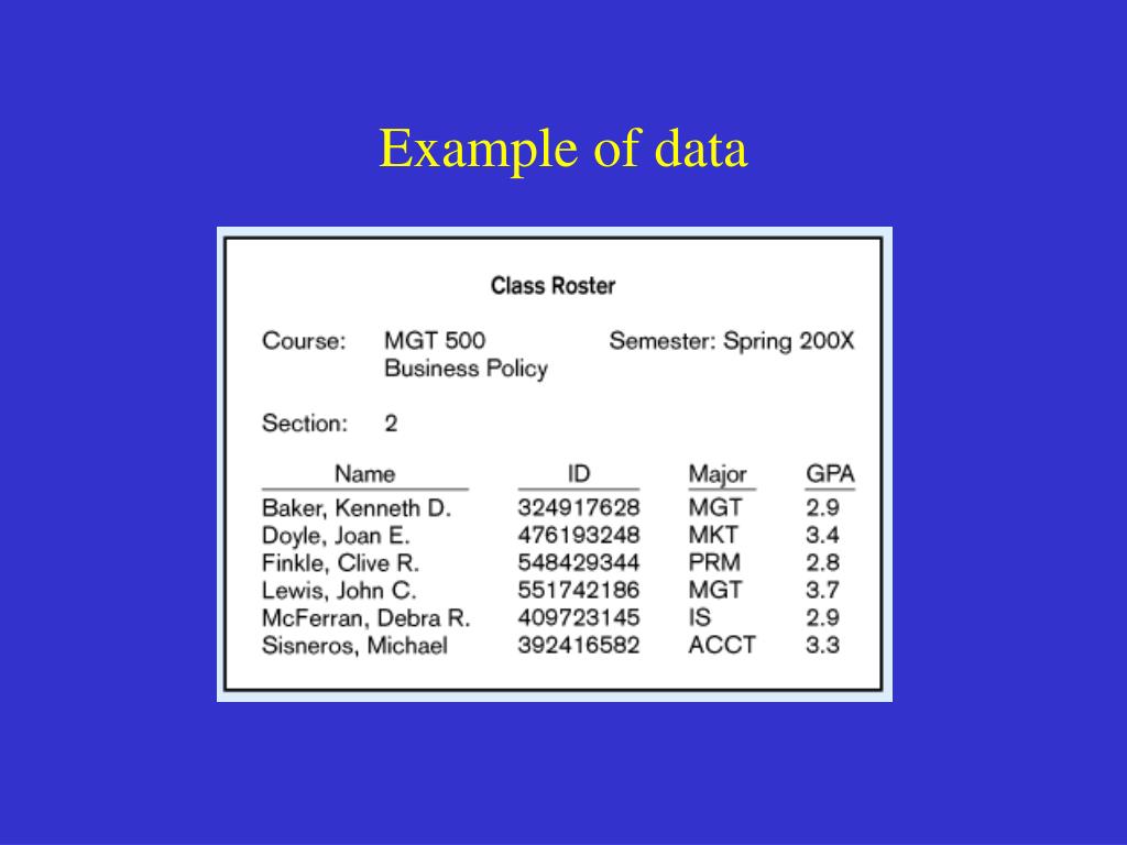 Data vs. Information • Data • refers to raw facts • Example: inventory part number or sales orders • Information • refers to data that have been processed and presented in a form suitable for human interpretation • Example: total number of registered students based on each major or geographical purchasing pattern of SUV