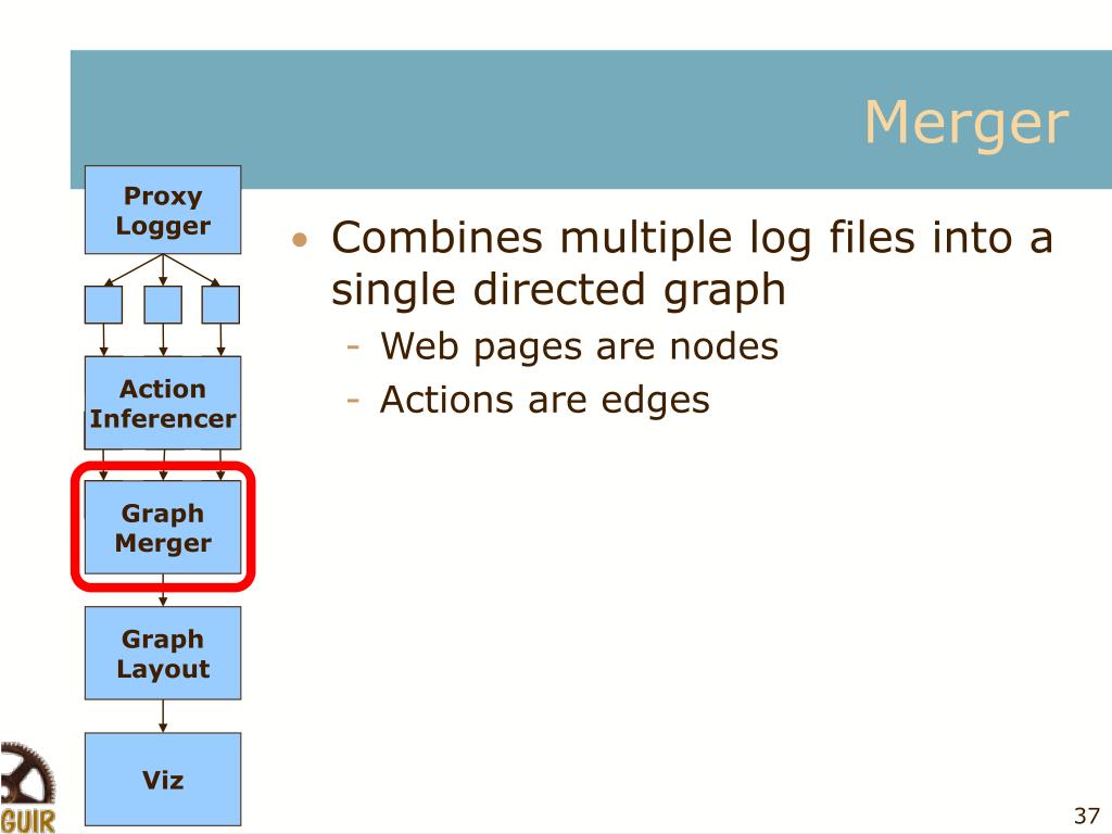 Proxy Logger Action Inferencer Graph Merger Graph Layout Viz Proxy • Lies between browser and server http://domain.com/webquilt?replace=http://www.yahoo.com • One log file per user session • Currently use Java servlets • Important part is log file format