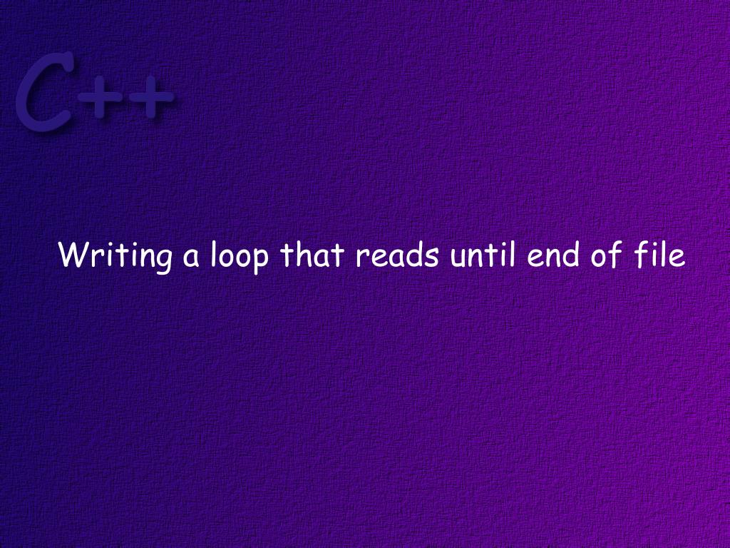 theFile.open("c:\\theFile02.txt"); while (theFile >> theData) { cout << "\nSuccessfully read in the value " << theData; } // dropped out, so read failed, see if it is eof or an error if (!theFile.eof( ) ) { cout << "\nCould not read an integer - bad data in the file."; } else { cout << "\nReached the end of the file."; }