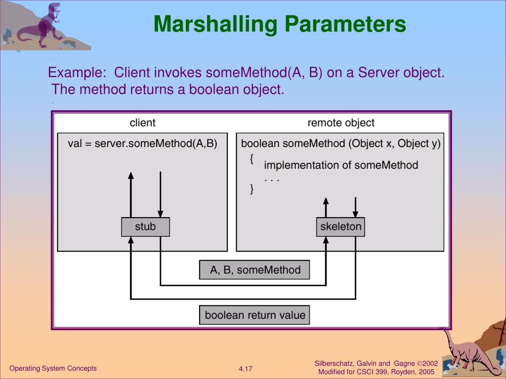 Marshalling Parameters Example: Client invokes someMethod(A, B) on a Server object. The method returns a boolean object. Operating System Concepts