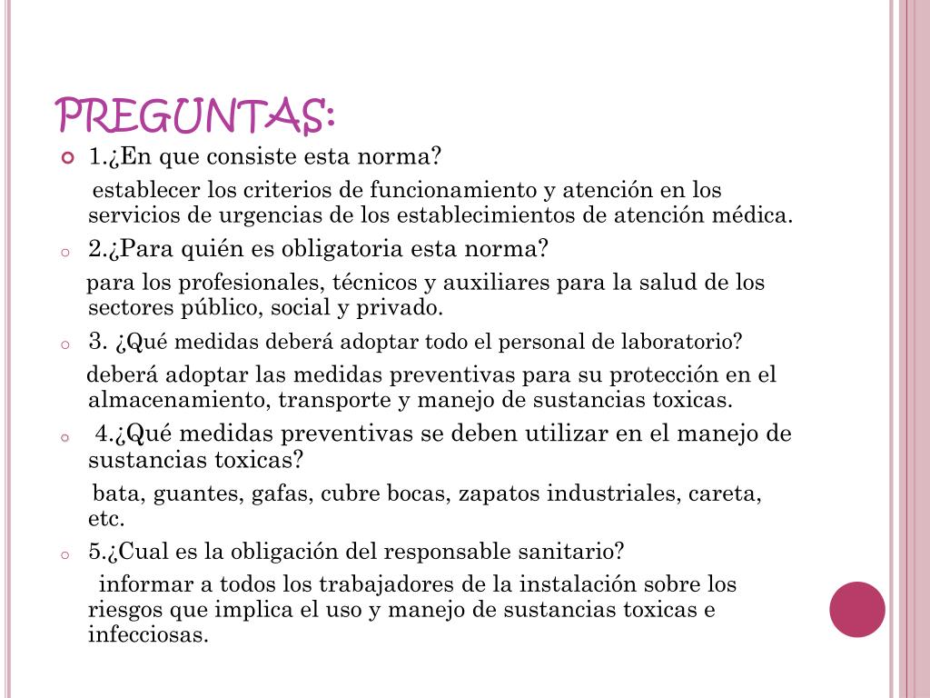 PREGUNTAS: • 1.¿En que consiste esta norma? establecer los criterios de funcionamiento y atención en los servicios de urgencias de los establecimientos de atención médica. • 2.¿Para quién es obligatoria esta norma? para los profesionales, técnicos y auxiliares para la salud de los sectores público, social y privado. • 3. ¿Qué medidas deberá adoptar todo el personal de laboratorio? deberá adoptar las medidas preventivas para su protección en el almacenamiento, transporte y manejo de sustancias toxicas. • 4.¿Qué medidas preventivas se deben utilizar en el manejo de sustancias toxicas? bata, guantes, gafas, cubre bocas, zapatos industriales, careta, etc. • 5.¿Cual es la obligación del responsable sanitario? informar a todos los trabajadores de la instalación sobre los riesgos que implica el uso y manejo de sustancias toxicas e infecciosas.
