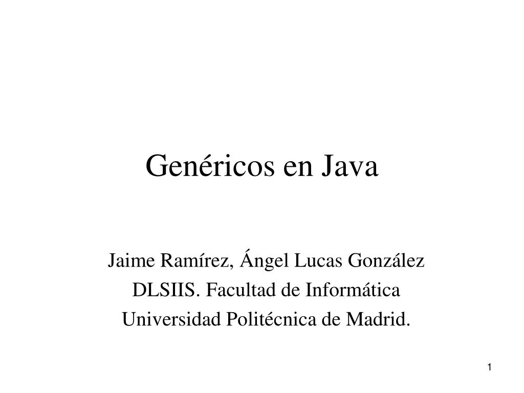Genéricos en Java. Jaime Ramírez, Ángel Lucas González DLSIIS. Facultad de Informática Universidad Politécnica de Madrid. Introducción. Java permite definir clases con variables o parámetros que representan tipos => Clases genéricas
