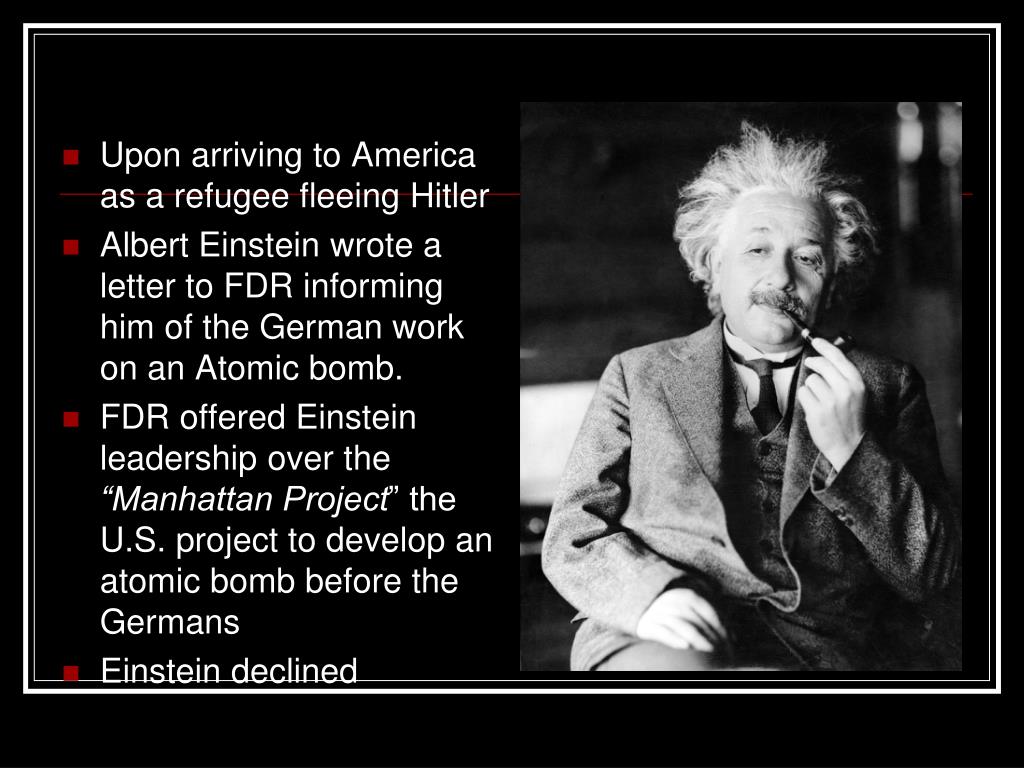 Upon arriving to America as a refugee fleeing Hitler • Albert Einstein wrote a letter to FDR informing him of the German work on an Atomic bomb. • FDR offered Einstein leadership over the “Manhattan Project” the U.S. project to develop an atomic bomb before the Germans • Einstein declined
