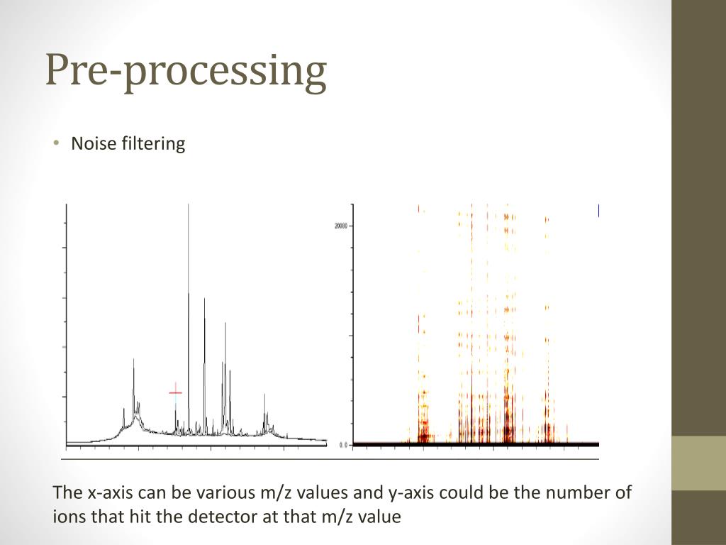 Pre-processing • Noise filtering The x-axis can be various m/z values and y-axis could be the number of ions that hit the detector at that m/z value