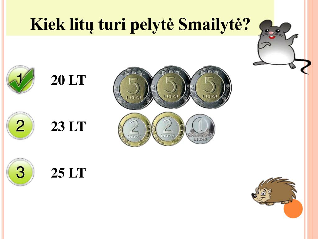 Kiek litų turi pelytė Smailytė? 20 LT 23 LT 25 LT